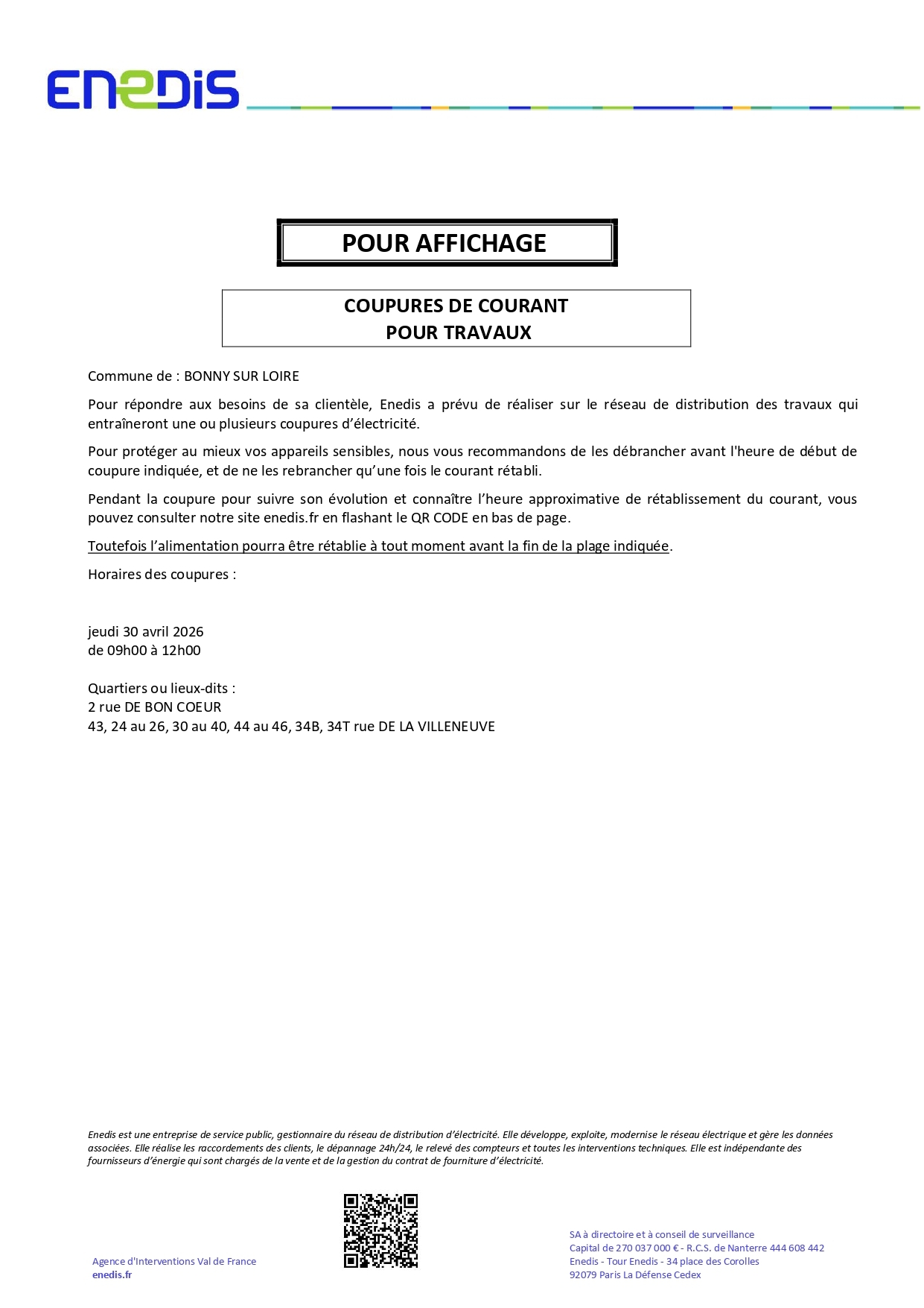 ENEDIS COUPURES DE COURANT LE 30/04/2026