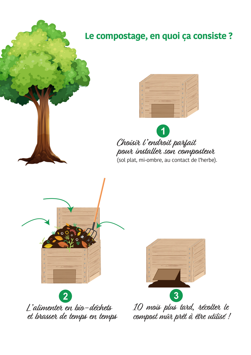 Installez le composteur sur un terrain plat, au contact de l’herbe/terre. Préférez un endroit légèrement ombragé et abrité du vent.